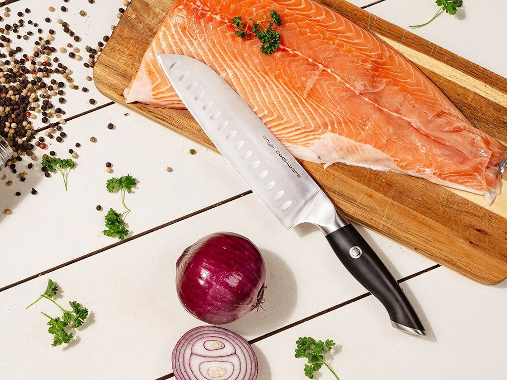 Das Santokumesser ist ein Allzweck-Küchenwerkzeug, das für jeden Hobbykoch unentbehrlich ist. „Santoku“ bedeutet „drei Tugenden“, was sich auf seine Fähigkeit bezieht, meisterhaft zu schneiden, zu würfeln und zu hacken. Und das ONYX COOKWARE™ Santokumesser zeichnet sich hierbei aus, aufgrund seiner kleineren Klingenlänge, die es leicht handhabbar macht.