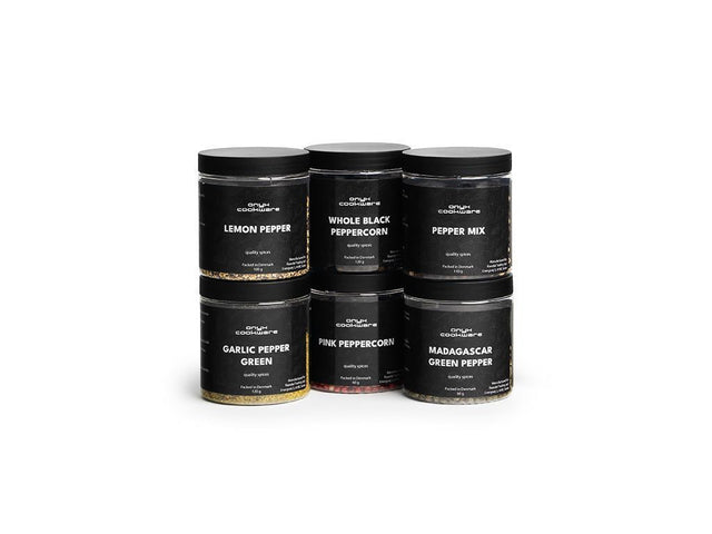 ONYX COOKWARE™ PFEFFER KOLLEKTION bietet eine Symphonie von Geschmacksrichtungen, die vielfältigen Geschmacksrichtungen und kulinarischen Vorlieben gerecht wird. Du kannst problemlos zwischen sechs verschiedenen Pfeffermischungen wählen, die alle auf deine Wünsche zugeschnitten sind. Ganz gleich, in welcher Pfefferstimmung du dich befindest, wir haben dich abgedeckt.