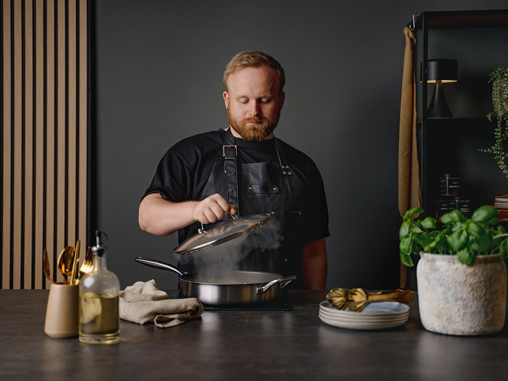 Diese Textur verleiht der Pfanne auf natürliche Weise ihre Antihaft-Eigenschaften. Sie reduziert den direkten Kontakt zwischen Ihrem Essen und der Oberfläche, sodass es sich leicht löst und schneller gereinigt werden kann. Und da diese Schicht ein Teil des Stahls selbst ist, gibt es nichts, das abnutzen könnte. Alle drei Schichten – der Stahl, das Aluminium und die nano-texturierte Oberfläche – sind dauerhaft miteinander verbunden. Nicht geklebt, nicht beschichtet, nicht gepresst. Einfach solide Metalltechnik, die für das tägliche Kochen mit maximaler Leistung entwickelt wurde.